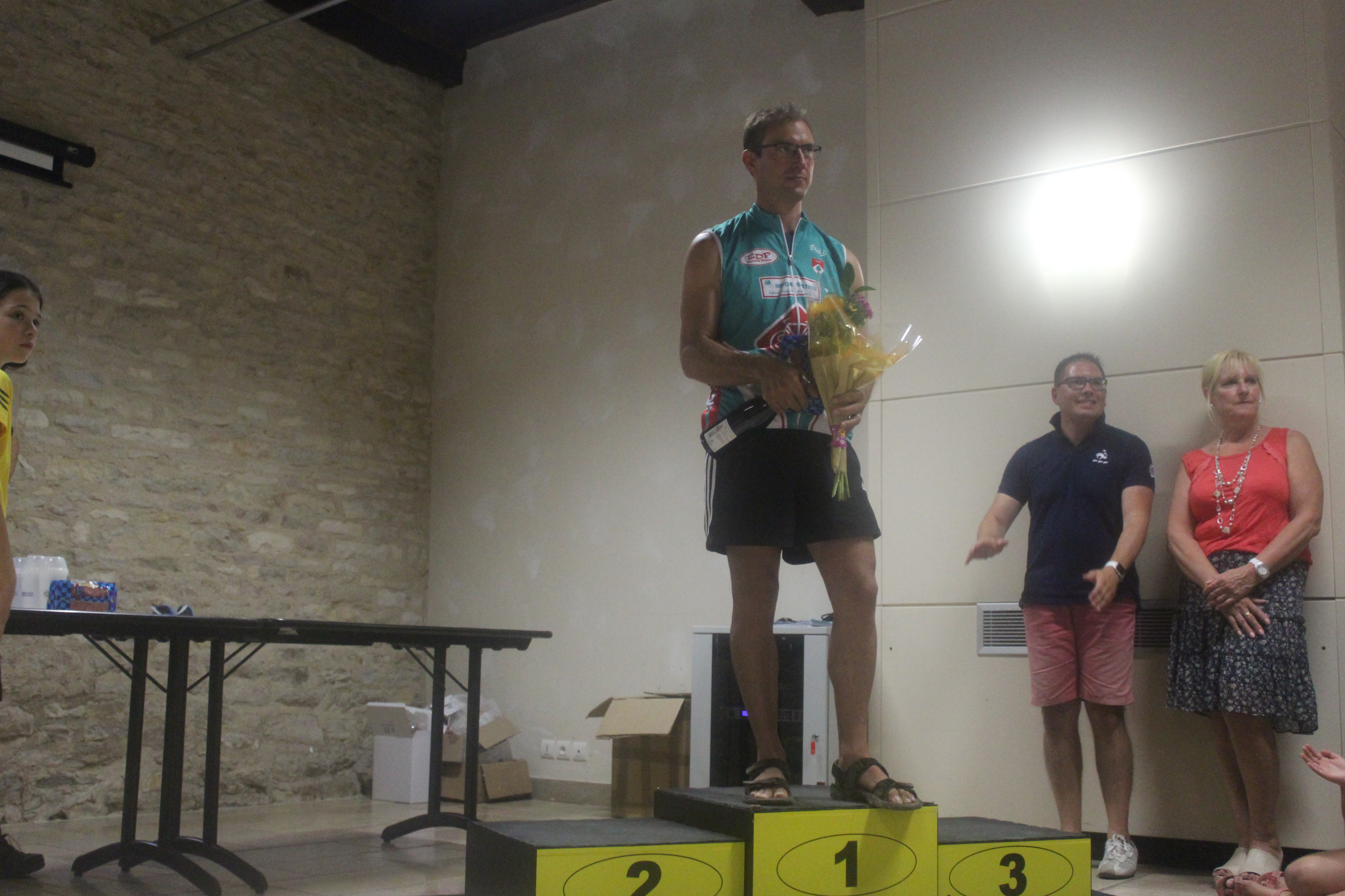 L’exploit de la journée est à mettre à l’actif de Fabien BERT qui part au premier tour dans une échappée à 4, puis sort tout seul pour effectuer la quasi intégralité de la course en tête. 40 bornes plus tard et 35 de moyenne au compteur, Fabien rejoint l’arrivée en solitaire avec 2 minutes d’avance sur le peloton. Après sa victoire à Verdun, Fabien comme en 2016 effectue un doublé Verdun/Laives et accède à la catégorie supérieure. Il pourra se tester au côté des autres 4 du club d’ici quelques mois à la reprise de la saison car Laives était la dernière course en ligne du calendrier FSGT 71. En revanche, Fabien va pouvoir désormais effectuer les chronos en 4 ; de quoi lui permettre de se confronter à d’autres coureurs et ainsi de progresser encore dans un sport qu’il ne pratique que l’été pendant la trêve des footeux … ceci est d’autant plus remarquable qu’il ne totalise que peu de kilomètres au compteur au regard que ce n’était que sa sixième course de la saison : 2 victoires sur 6, c’est un beau raciaux !